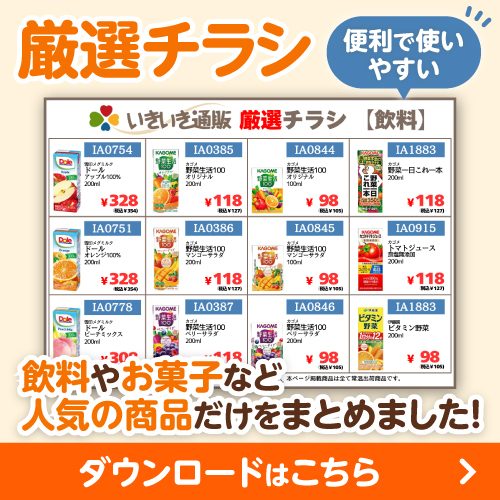 いきいき通販Web発注サイトでは、最新の商品情報を表示するよう努めておりますが、メーカー都合等により商品規格・仕様が変更される場合がございます。そのため、お届け商品のご使用前には商品のラベルや注意書きをご確認くださいますようお願い致します。
